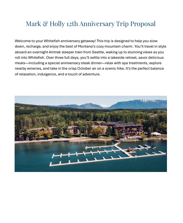 This is an example of an itinerary made for Mark & Holly’s anniversary getaway.